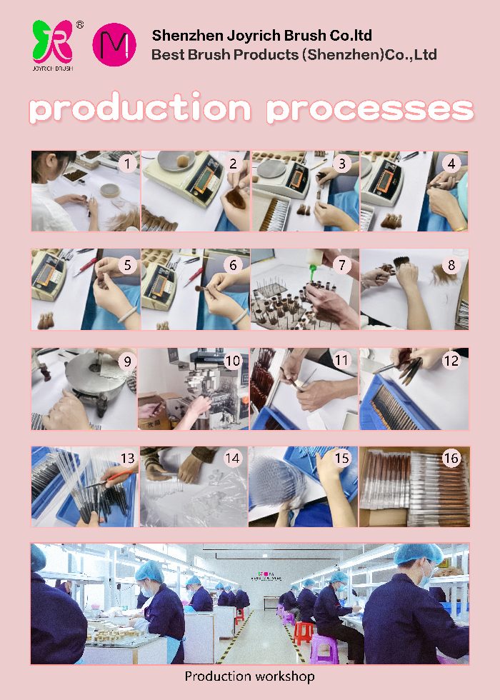 نحن نعمل مع مرافق الإنتاج المتخصصة، والمعدات المتطورة، وفريق من الحرفيين ذوي الخبرة. كما نقدم أيضًا خدمات مخصصة، بما في ذلك وضع العلامات الخاصة وأحجام الفرشاة المخصصة وتصميمات المقابض.